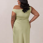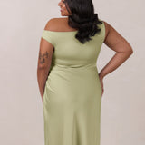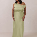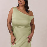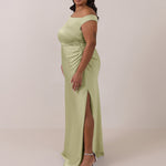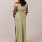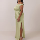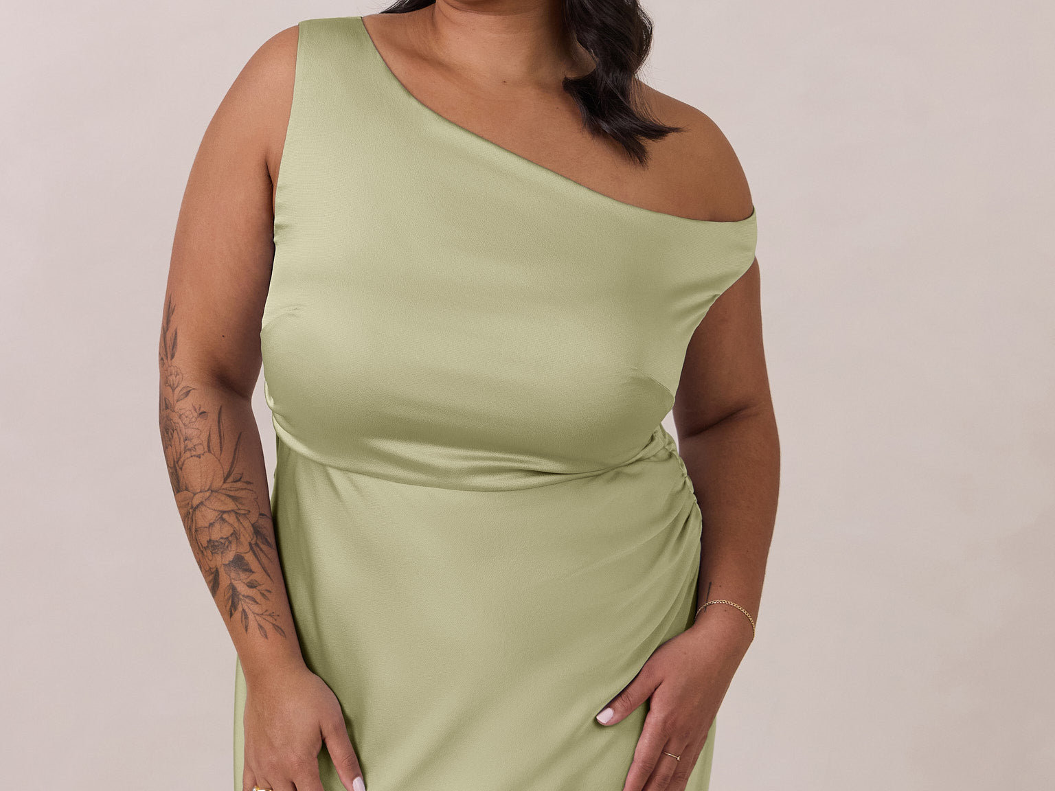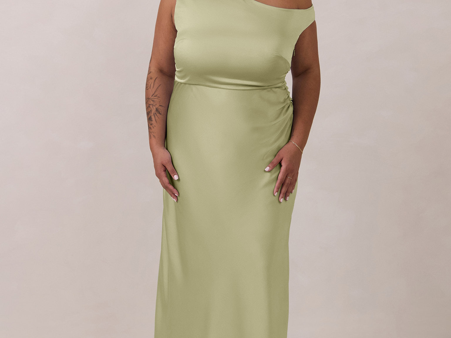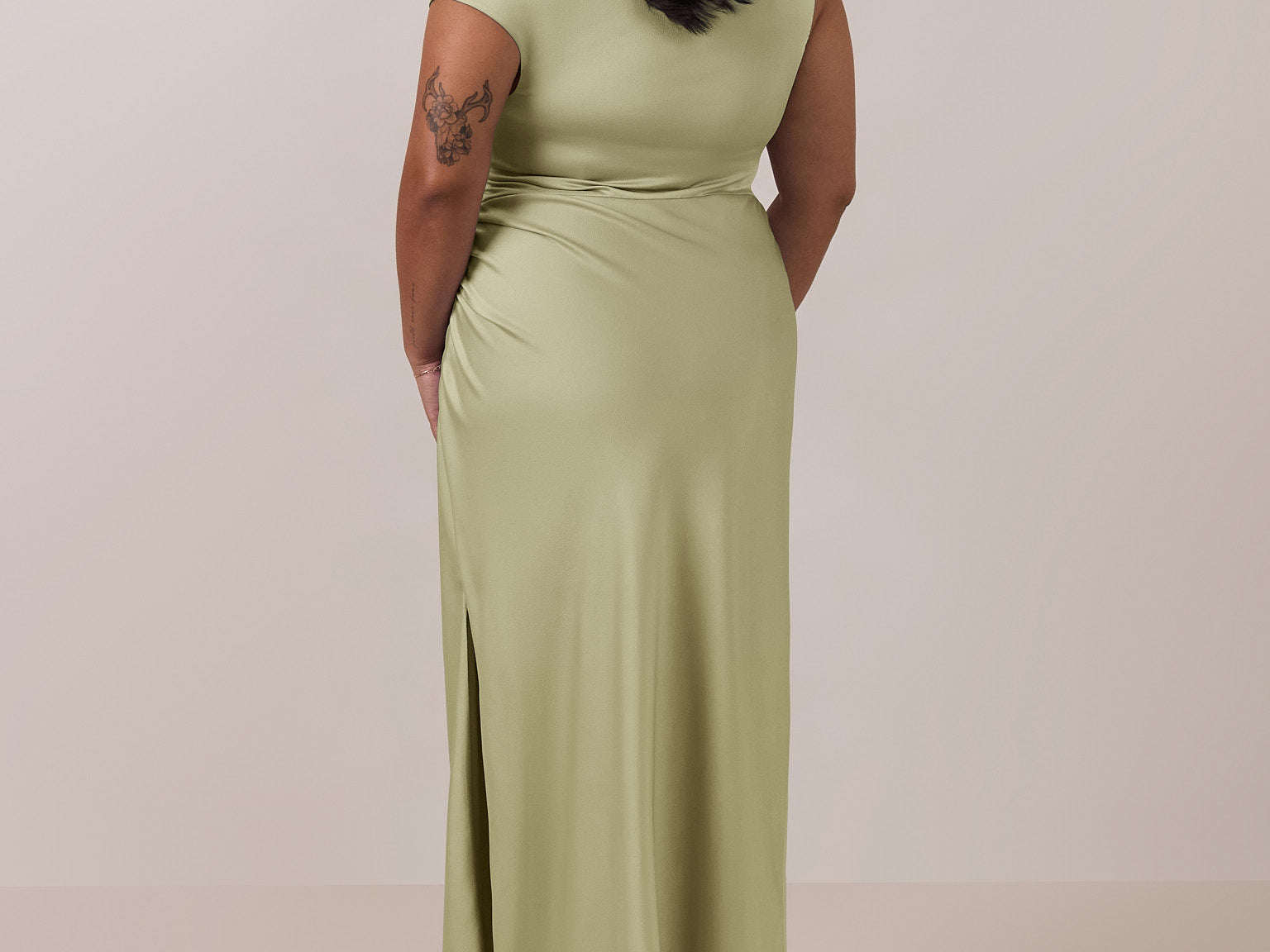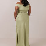 We love an asymmetrical neckline. This full-length dress strikes the perfect balance between modern sophistication and a flattering fit with its elegant silhouette, slightly gathered bodice, and a stylish side slit for a touch of effortless elegance.