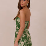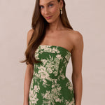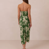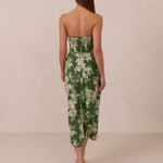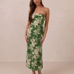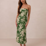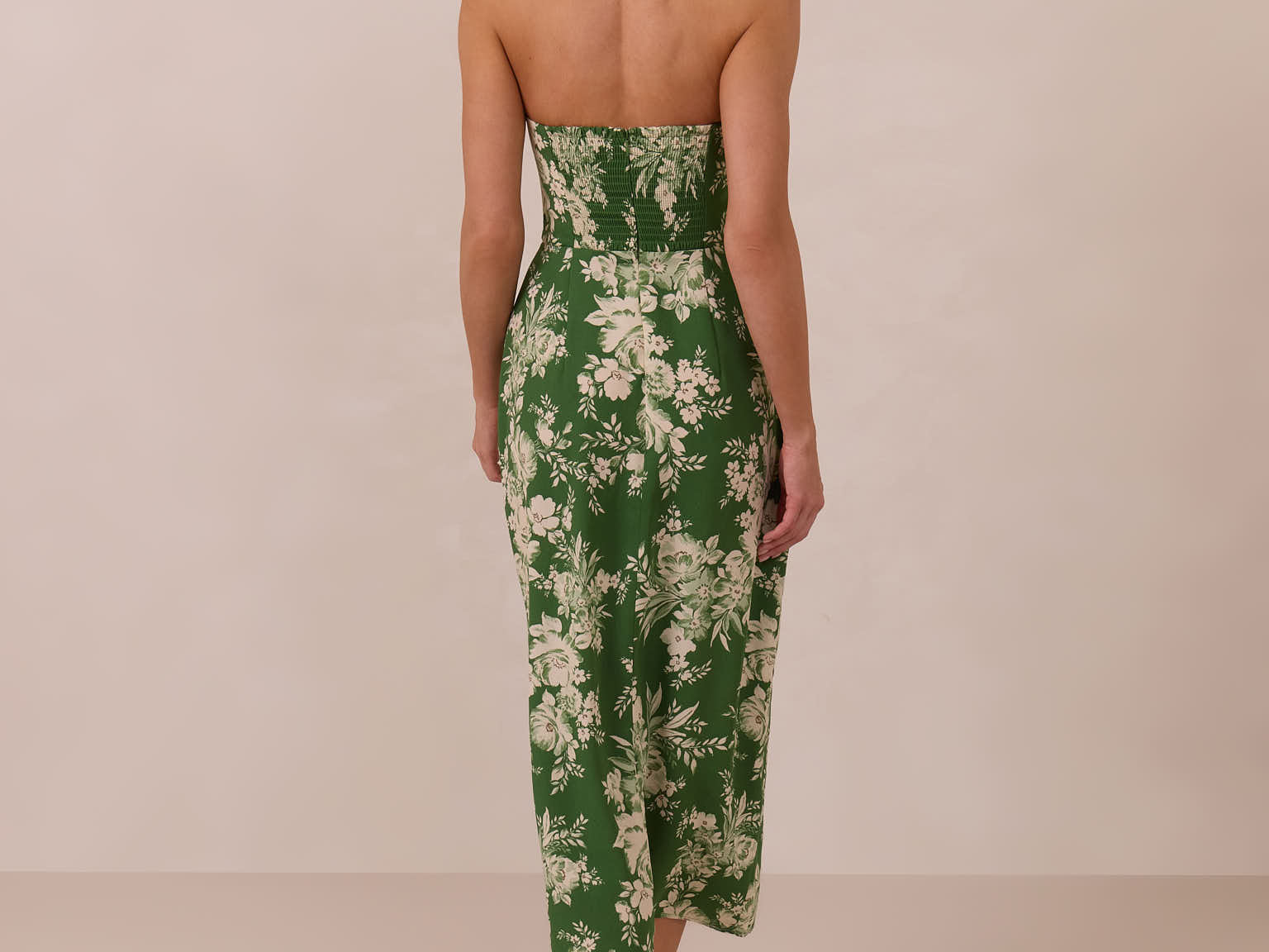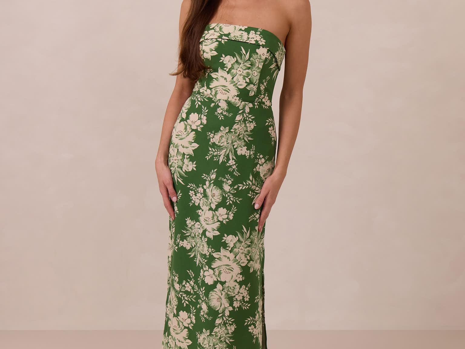 Structured and streamlined, the Vaughn Dress is a strapless midi with a clean, minimal silhouette. It features a fitted bodice with boning for added support, a straight neckline, and subtle back shirring for a flexible fit.