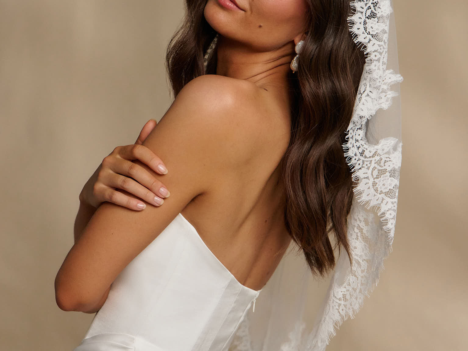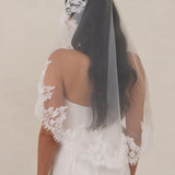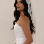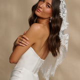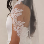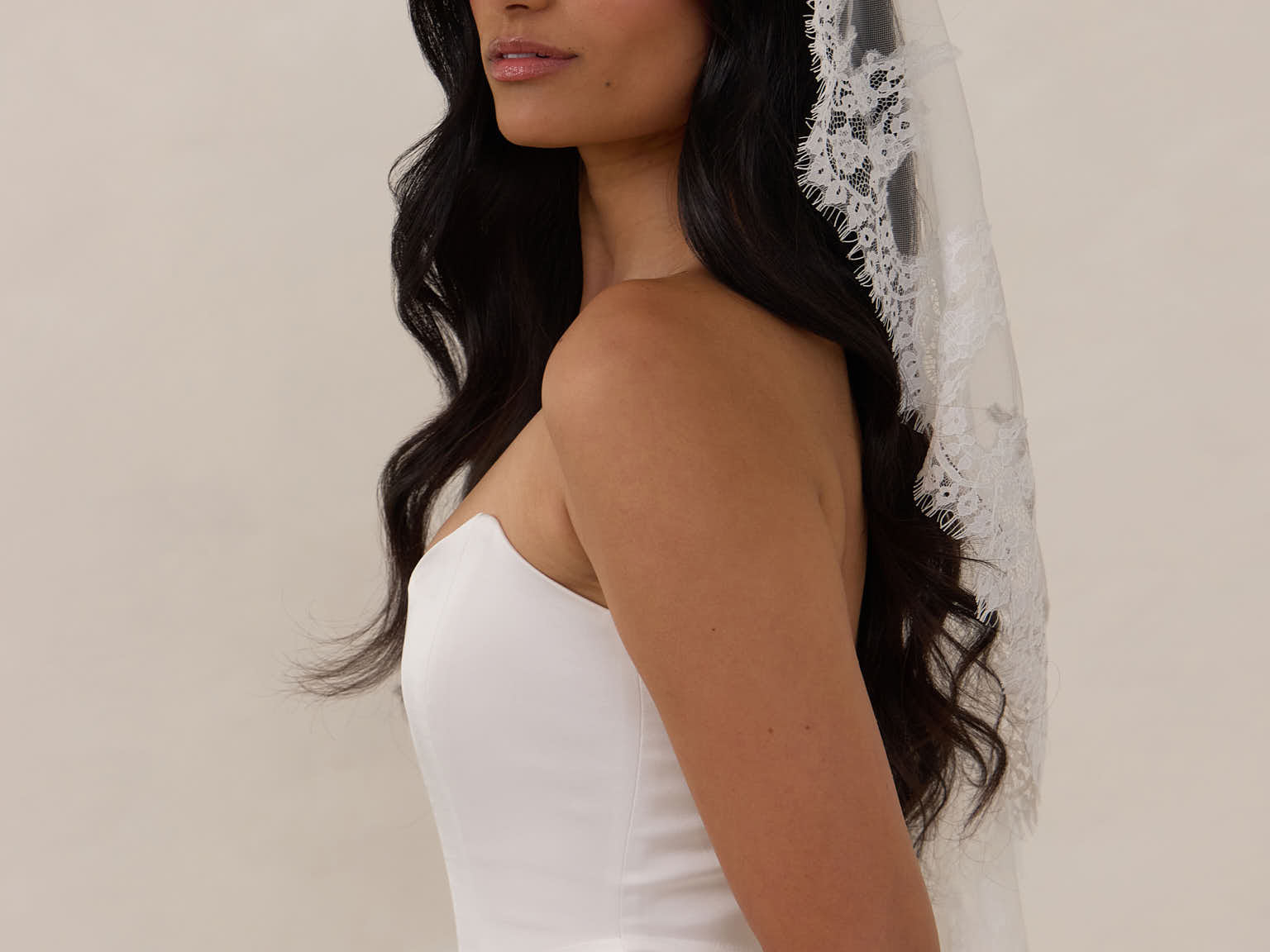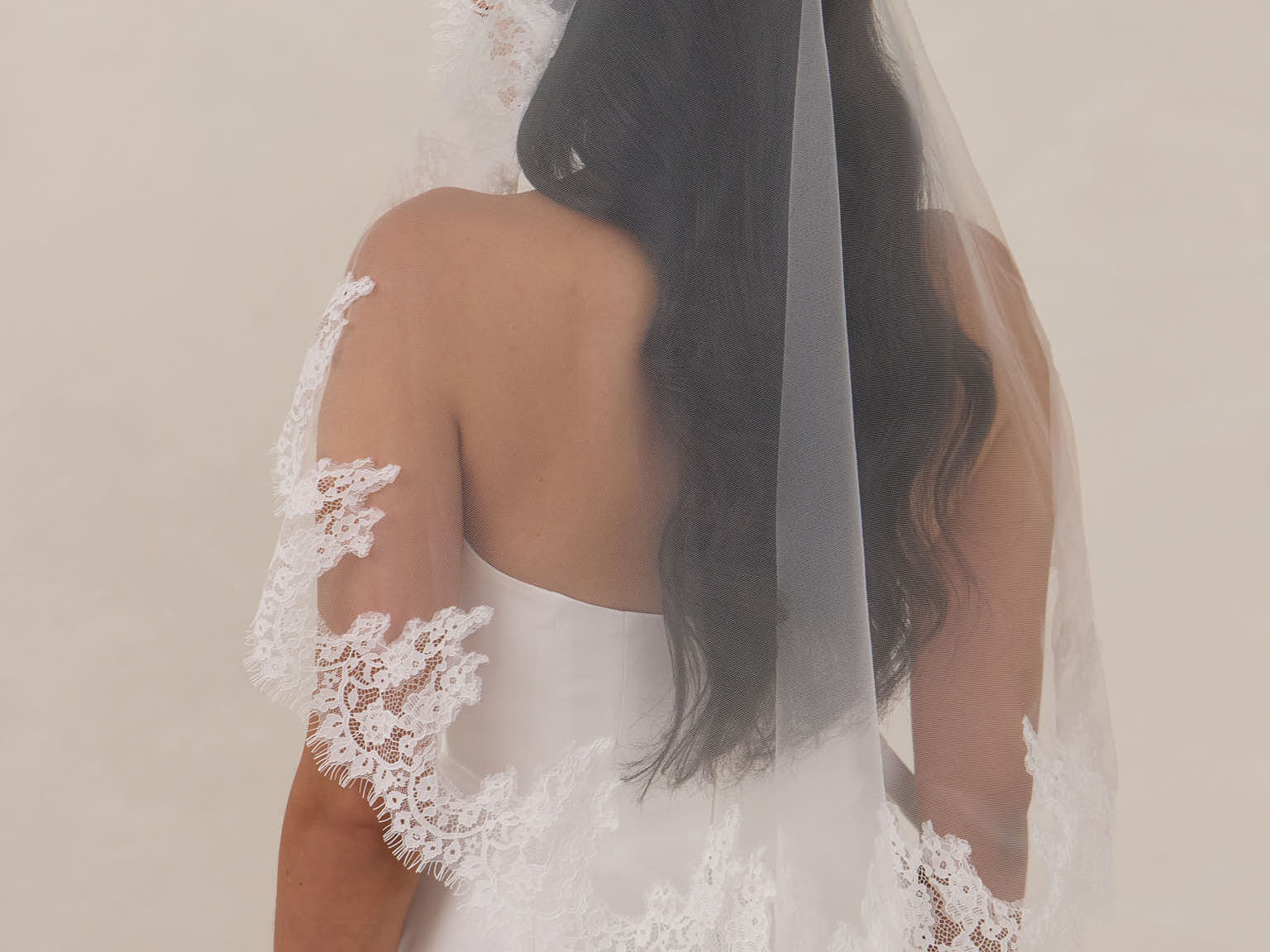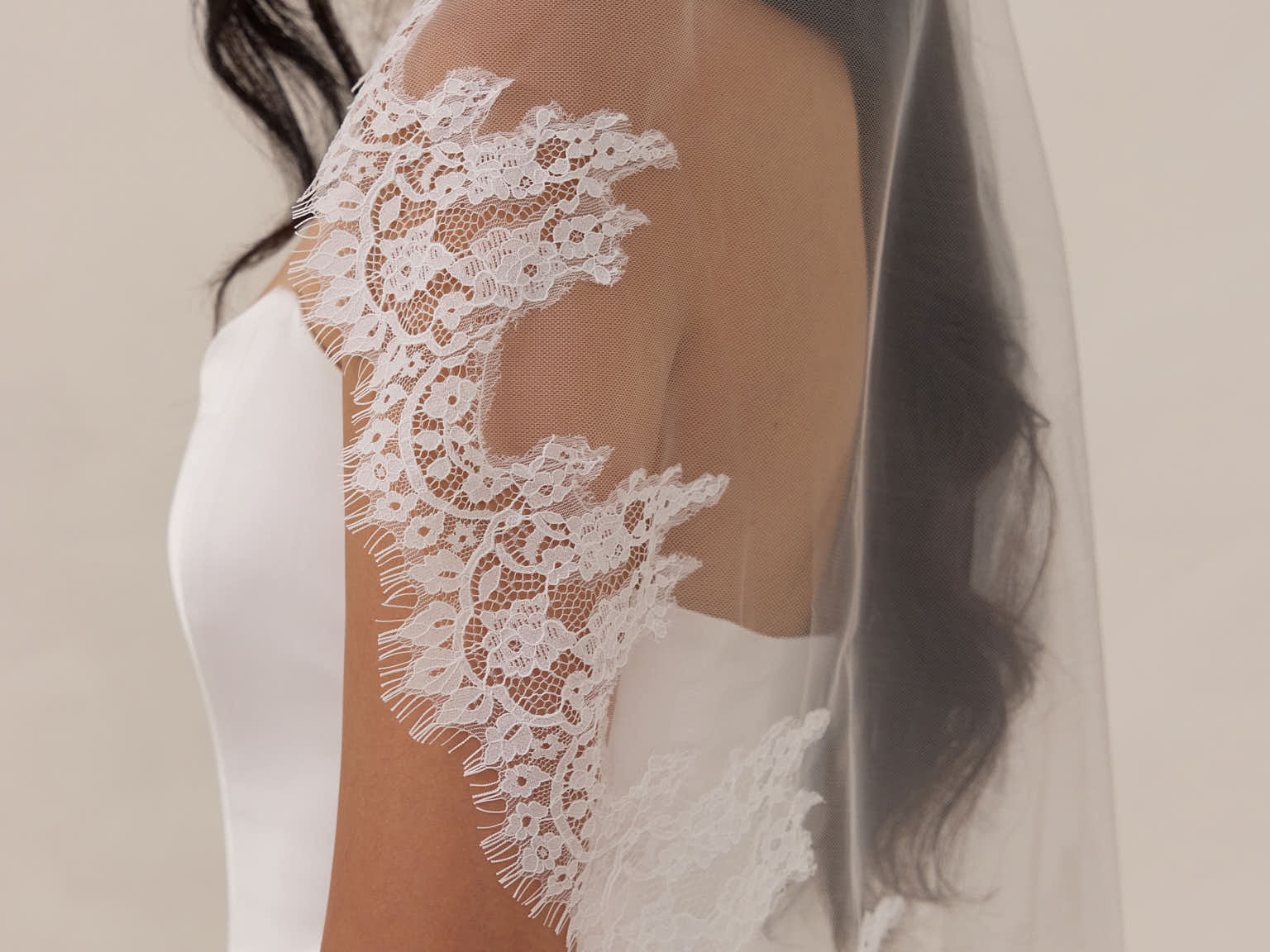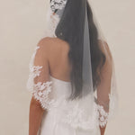 The Lisette Veil blends contemporary style and vintage charm with soft tulle and intricate lace. This mid-back length veil offers a sleek, modern silhouette with a vintage twist: detailed lace edging for timeless romance and subtle texture.