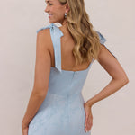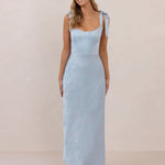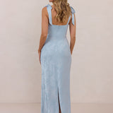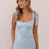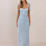Crafted from luxurious Jacquard satin, this dress features feminine tie straps and a flattering bias-cut skirt, offering a flattering silhouette with timeless appeal.